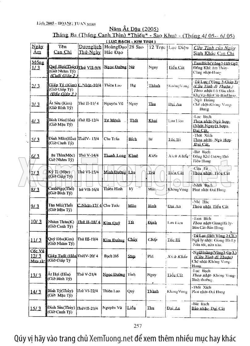 • Xem Ngày Tốt Xấu Vạn Sự: Cung cấp thông tin chính xác về ngày Hoàng đạo, Hắc đạo, giờ tốt xấu (theo các phương pháp cổ truyền như Tam Tông Miếu, Khổng Minh Lục Diệu...) để bạn lựa chọn được thời điểm lý tưởng cho mọi công việc quan trọng.