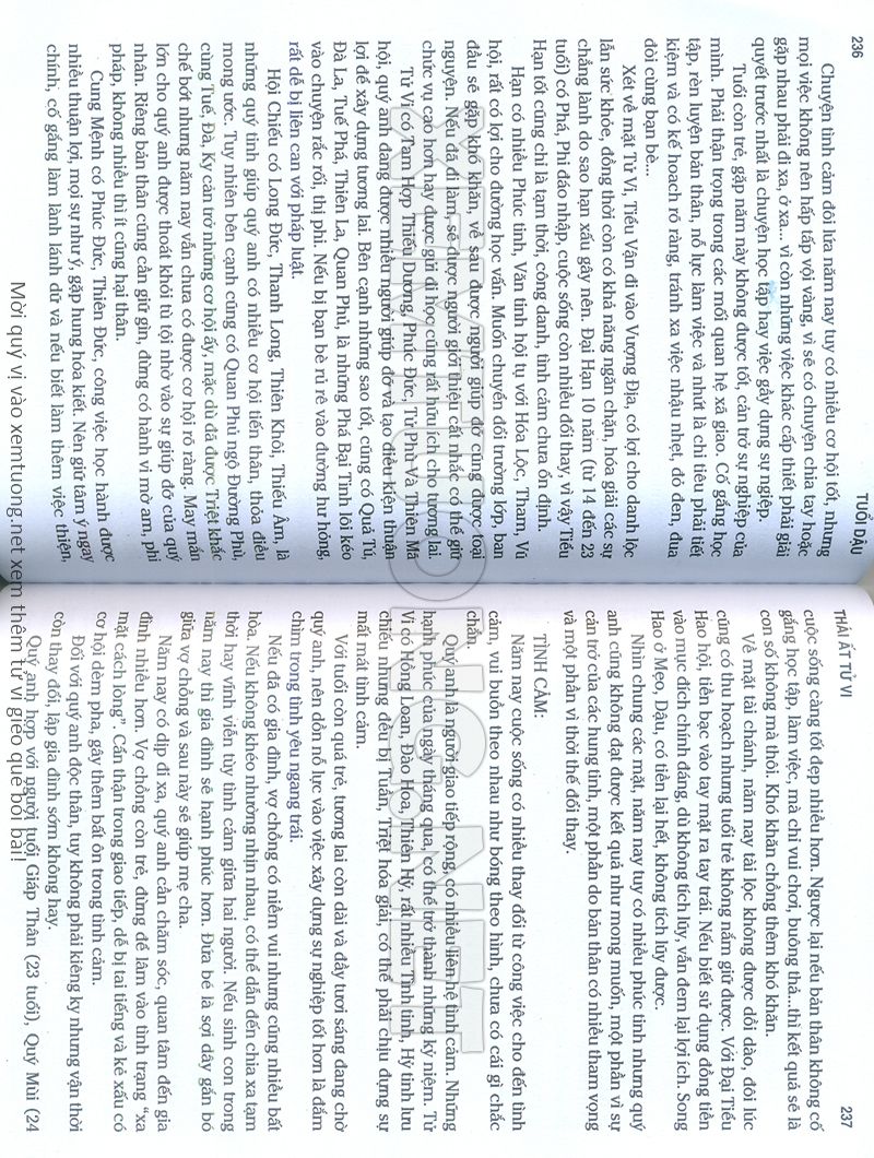 (Lưu ý: Thái Ất Tử Vi được chúng tôi scan từ sách, do đó mỗi tuổi sẽ có nhiều trang, quý vị xem xong hãy nhấn vào trang tiếp theo để xem hết phần tuổi muốn xem. Nếu quý vị xem bằng điện thoại thì hãy kéo qua lại để xem phần bị khuất.)