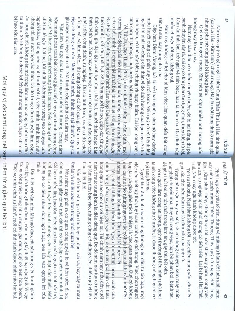 (Lưu ý: Thái Ất Tử Vi được chúng tôi scan từ sách, do đó mỗi tuổi sẽ có nhiều trang, quý vị xem xong hãy nhấn vào trang tiếp theo để xem hết phần tuổi muốn xem. Nếu quý vị xem bằng điện thoại thì hãy kéo qua lại để xem phần bị khuất.)