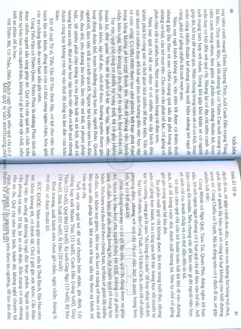 (Lưu ý: Thái Ất Tử Vi được chúng tôi scan từ sách, do đó mỗi tuổi sẽ có nhiều trang, quý vị xem xong hãy nhấn vào trang tiếp theo để xem hết phần tuổi muốn xem. Nếu quý vị xem bằng điện thoại thì hãy kéo qua lại để xem phần bị khuất.)